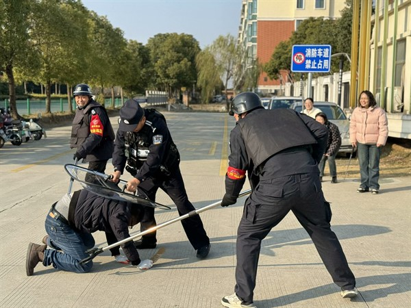演練期間,一名佯裝以探視幼兒為借口的“歹徒”,手持器械妄圖強行闖入校園。面對這一“不速之客”,校園保安迅速反應(yīng),當(dāng)即對歹徒予以勸阻,并即刻啟動一鍵報警系統(tǒng)向公安機關(guān)報警,同時向園內(nèi)應(yīng)急指揮部匯報情況。相關(guān)責(zé)任教師在警報拉響后,迅速且有條不紊地將正在戶外開展活動的幼兒疏散至安全地帶。應(yīng)急小組、校園保安與在場民警緊密協(xié)作,運用防暴盾牌筑起堅固防線進(jìn)行格擋防御,借助鋼叉巧妙干擾歹徒的行動。憑借彼此間的高度默契配合,逐步縮小對歹徒的包圍圈。在全體現(xiàn)場人員的齊心協(xié)力之下,最終成功將歹徒制服。整個演練流程各個環(huán)節(jié)緊密銜接、有條不紊,順利達(dá)成預(yù)期目標(biāo)。