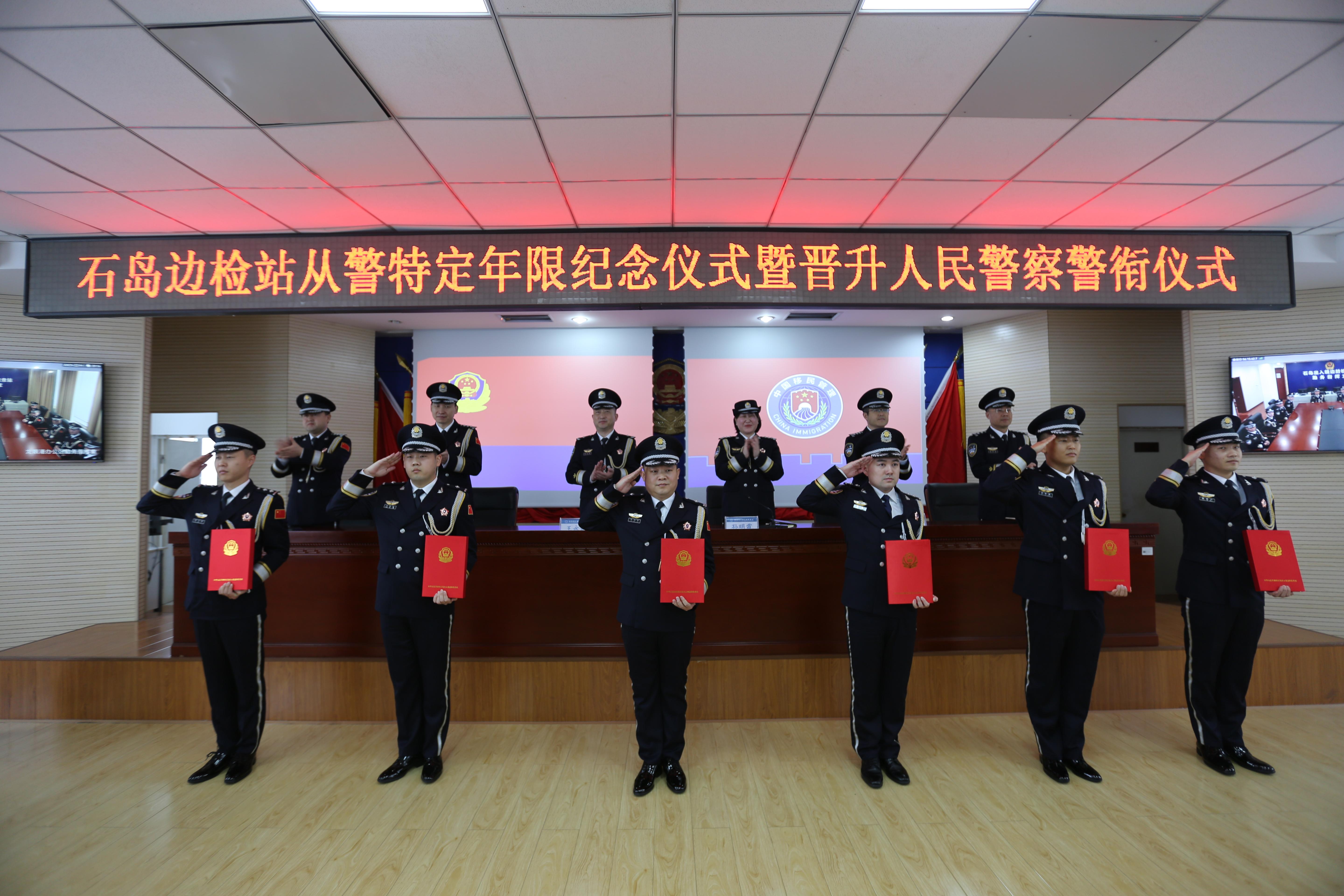 隨后,站黨委書記、站長王永春同志代表站黨委向從警特定年限和晉升警銜民警職工表示祝賀,他指出,授予晉升警銜是組織的激勵,也是黨和人民更大的信任,希望晉銜人員要心無旁騖干好主責主業(yè),時刻把使命放在心上、把責任扛在肩上,與最優(yōu)對標、與強者比拼、與快者賽跑,主動迎接挑戰(zhàn)、經(jīng)歷考驗、接受檢驗,以嶄新面貌和優(yōu)異業(yè)績?yōu)樽约旱膹木脑鎏硇碌墓獠?。最后,全體民警重溫了公安機關(guān)人民警察誓詞,并拍照留念。(石島出入境邊防檢查站 畢凱珺 崔浩 常亮)