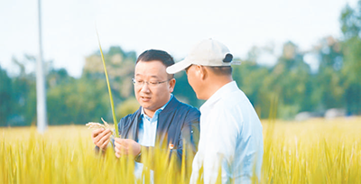 張家墊村黨總支書記張?jiān)疲ㄗ螅┥钊胩镩g地頭向種糧大戶了解種植情況(資料圖片)
