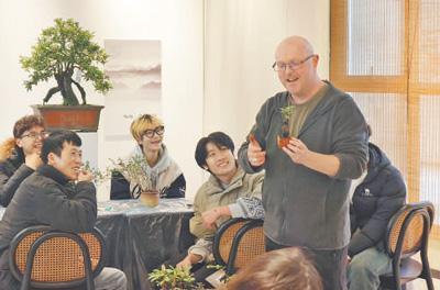 白熊(右一)正在上盆景課。白熊供圖
