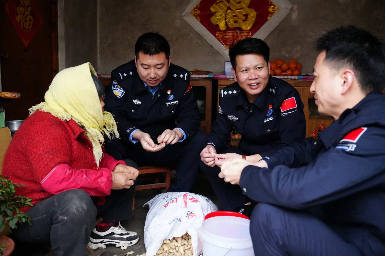 據(jù)了解,董翠蓮老人患有眼疾,孤身照顧身有殘疾的老伴已有20余年。當(dāng)民警楊曉龍、胡云龍、李虎一行走進(jìn)董翠蓮老人家中時(shí),老人正在屋里剝花生。“大娘,我們來幫您!”民警們立即放下手中的慰問品,圍坐在老人身邊剝起花生來?!皠傁峦暧?,風(fēng)大,您年齡大了出門不安全,有什么需要給我們打電話?!薄白罱秒姟⒂脷庖欢ㄒ⒁獍踩?!”……句句關(guān)懷、聲聲叮嚀讓老人感動(dòng)不已。盡管雨后的天空陰沉沉的,但警民嘮嗑的笑聲在小院里此起彼伏?!斑@些孩子比親兒子還貼心,經(jīng)常來看我和我老伴,這次又送來這么多東西?!倍渖徖窬氖植蛔】滟?。