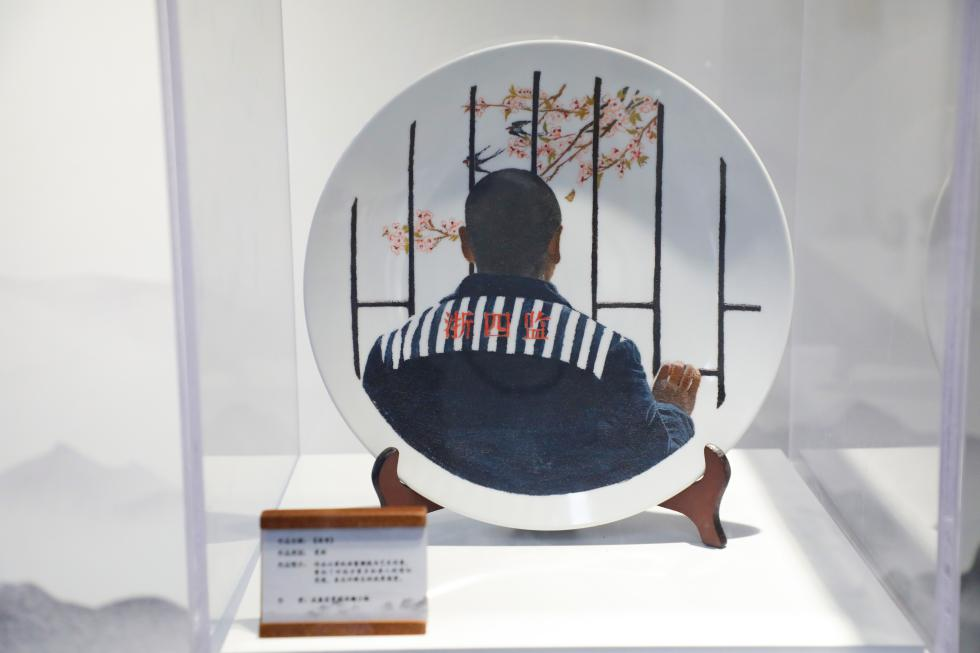 “叮叮?!庇沂殖骤F錘,左手拿鋼鑿,10余名罪犯仔細(xì)地在瓷盤上鑿刻圖案,鐵錘敲擊鋼鑿發(fā)出有節(jié)奏感的悅耳“叮?!甭暋@是浙江省第四監(jiān)獄瓷刻項(xiàng)目學(xué)習(xí)現(xiàn)場(chǎng)。