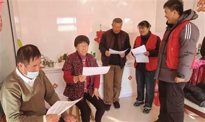 大辛村村干部上門(mén)宣傳《村規(guī)民約》。照片由寧河融媒體提供