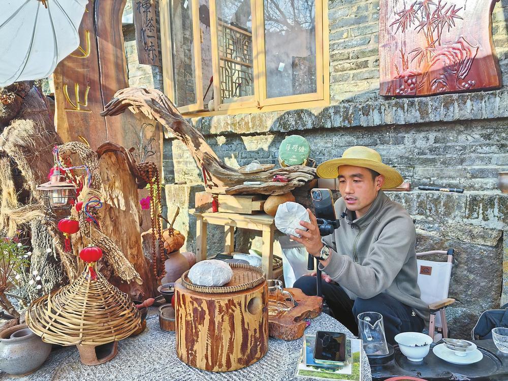 大乖來自陜西西安,是旅游愛好者。2022年,他通過網友介紹來到白云村,被這里“遠上寒山石徑斜,白云生處有人家”的詩意景致吸引,便決定旅居于此?!斑@里不僅風景如畫,還有茶葉、核桃、蜂蜜等土特產。我是主播,既然住下來,就想幫村民通過直播增收?!贝蠊缘南敕ǖ玫酱濉皟晌钡闹С?。他與團隊一起修繕村內的“禪茶小院”,用于短視頻拍攝,又把老電站舊址改造成簡易直播間,讓古樸的村莊刮起一場“電商風暴”。