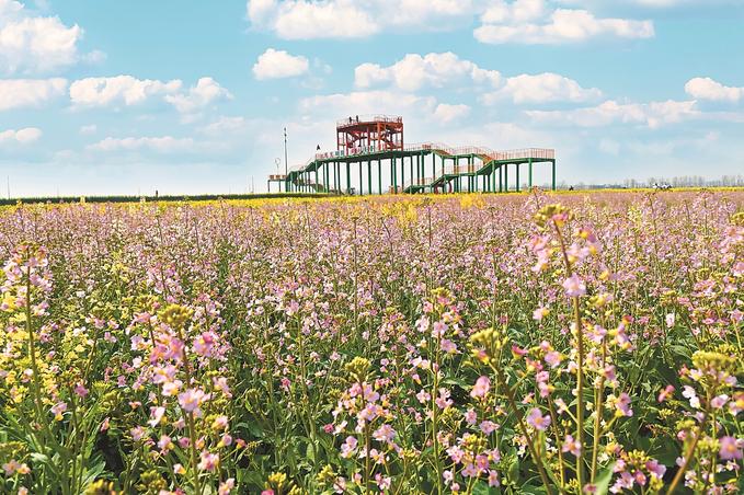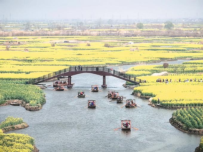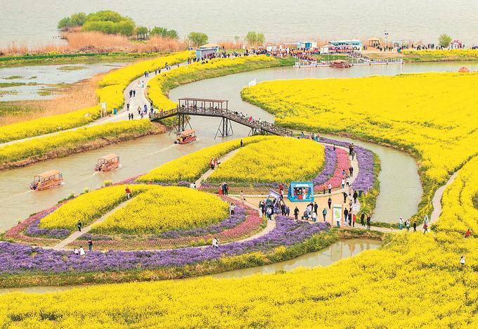 在蘇中,興化、高郵、如皋三市都不約而同“偏愛(ài)”油菜花。在興化千垛景區(qū),萬(wàn)畝垛田花海演繹“河有萬(wàn)灣多碧水,田無(wú)一垛不黃花”;在高郵湖上花海,“半城花海半城詩(shī)”的獨(dú)特景觀,吸引了眾多游客;在如皋平園池村,五彩油菜花好似打翻春日“調(diào)色盤(pán)”……
