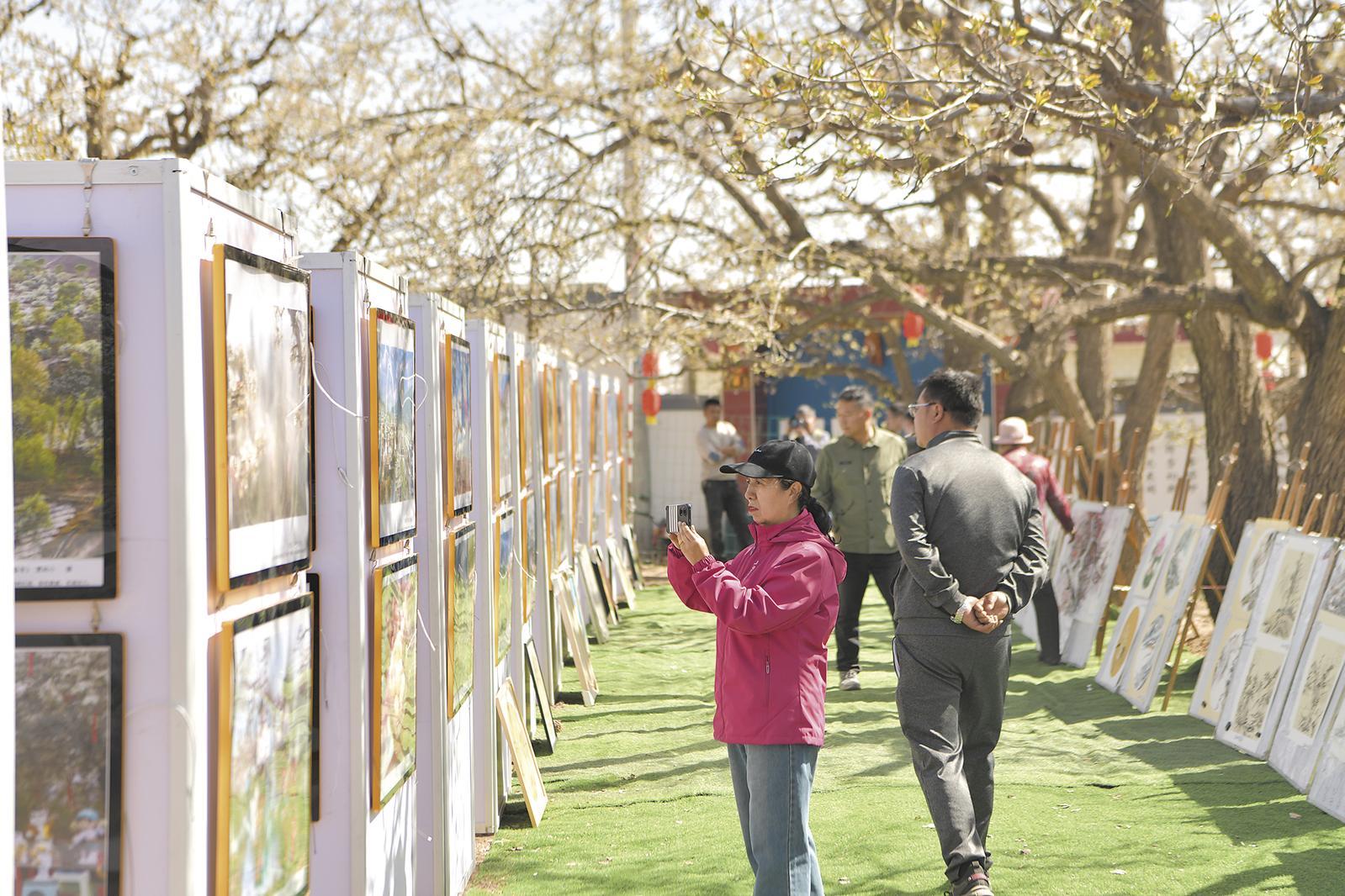 “梨園春色”主題攝影展吸引游客駐足。