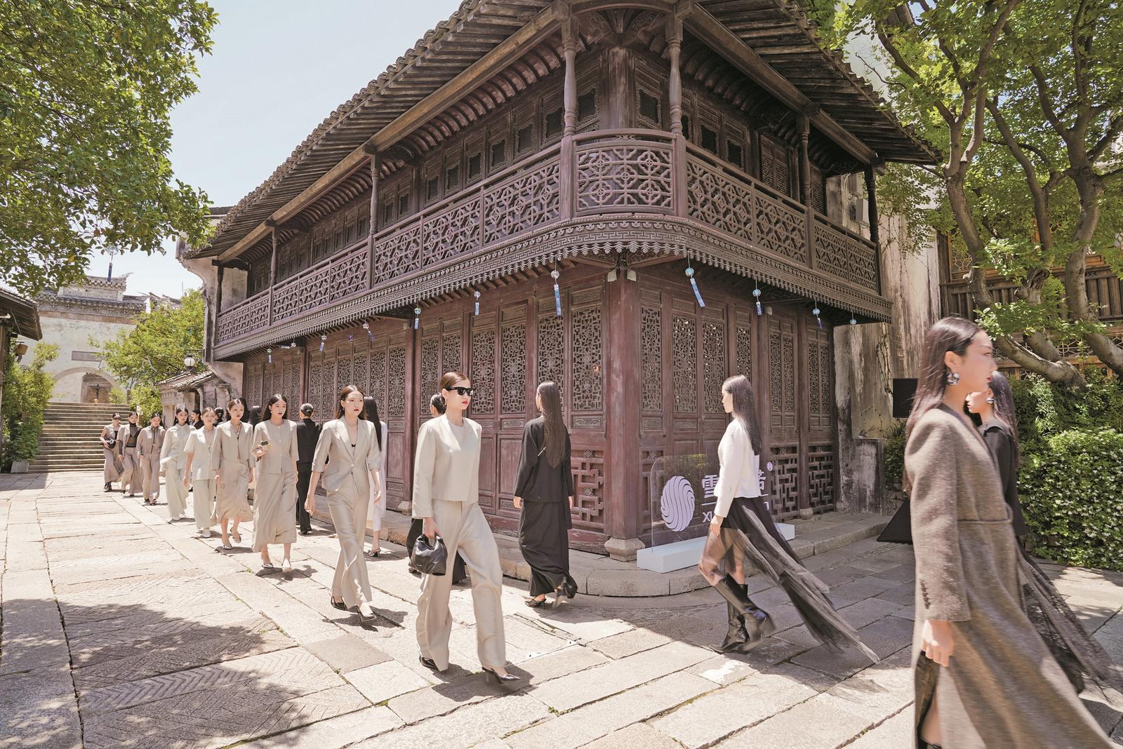 不只是在水上禪堂的室內(nèi)空間,小船上、拱橋旁、街巷中隨時會上演一場時裝秀。5月10日,古鎮(zhèn)當?shù)仄放蒲┙q諾的時裝秀在鳳棲街舉行,路過的游客被邀請來看秀。定位職業(yè)女性的雪絨諾服飾線條簡潔流暢,冷峻高雅,當模特從古色古香的中式建筑中款款走出,華美的衣裳、青石板的路面、潺潺的流水、民居的飛檐翹角、鳥兒在樹梢間盤旋著鳴叫……這一幅畫面令人印象深刻。
