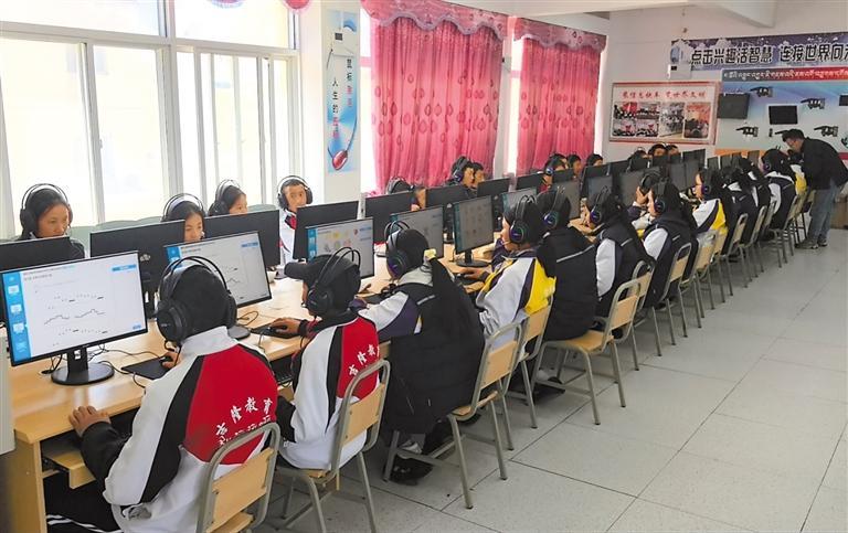 在日喀則市吉隆縣中學(xué)新機房內(nèi),學(xué)生們頭戴耳機跟隨教師指令進行實操訓(xùn)練。