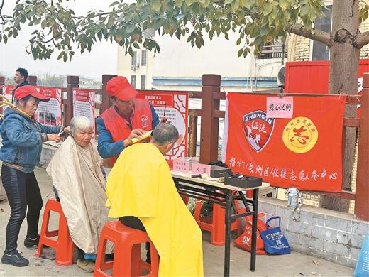 興龍街道平浪村志愿者服務(wù)隊在老區(qū)廣場開展愛心義剪。(長洲區(qū)融媒體中心供圖)