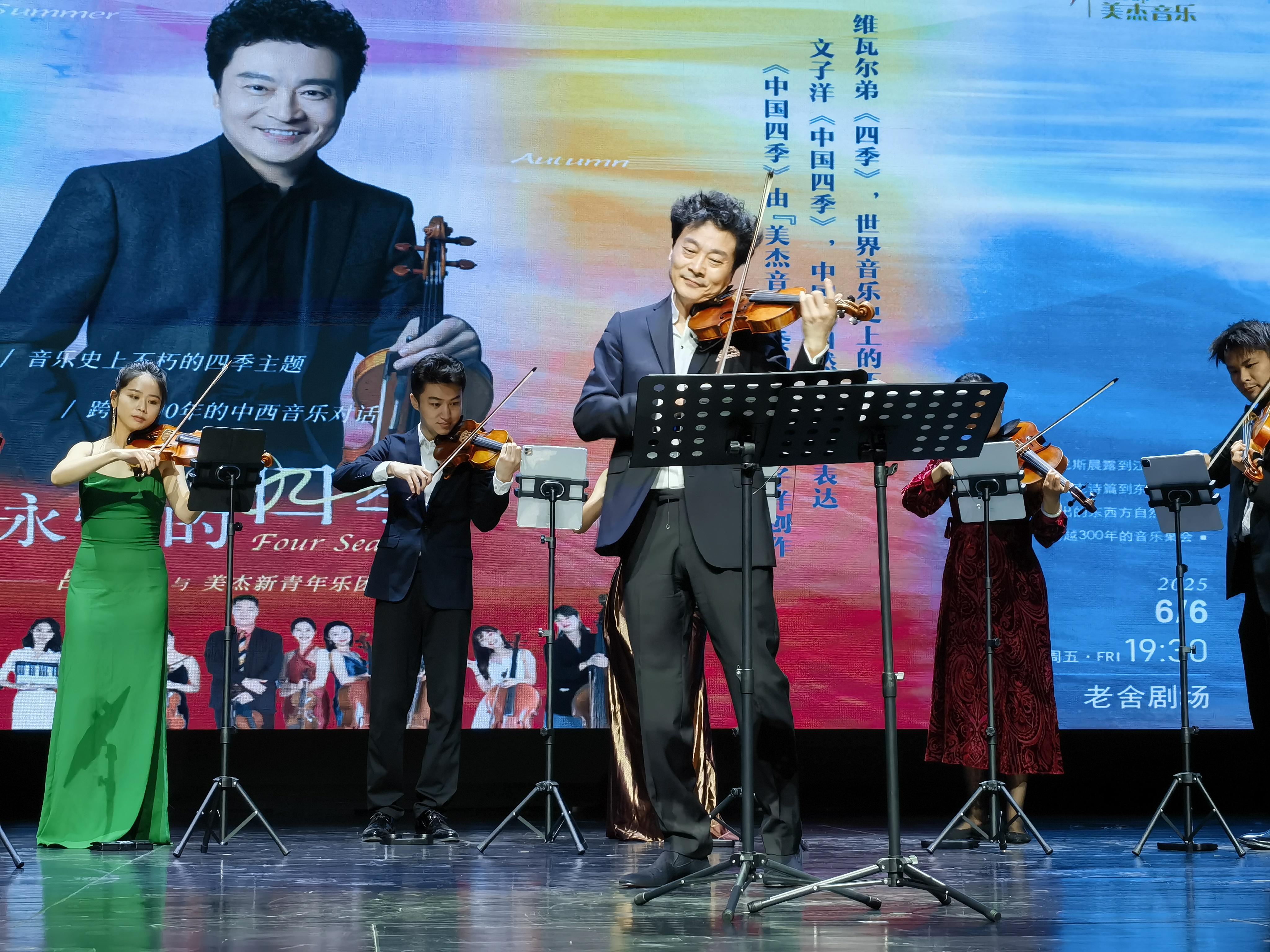 “和著飛快不息的音樂節(jié)拍,四季蹁躚而來,飄然而去——色彩、旋律、芳香匯成不竭的瀑布傾瀉而下,時(shí)刻在豐沛的歡樂中飛濺、墜落、消亡”。這是印度詩人泰戈?duì)栐谄浍@得諾貝爾文學(xué)獎(jiǎng)的詩集《吉檀迦利》中發(fā)出的感喟。6月6日,適逢二十四節(jié)氣里唯一直接指導(dǎo)農(nóng)事活動(dòng)的芒種——“忙種”期間,筆者在北京老舍劇場觀賞《永恒的四季——呂思清與美杰新青年樂團(tuán)音樂會(huì)》,對(duì)詩人之榮枯慨嘆越發(fā)感同身受。是的,和著節(jié)拍,四季蹁躚若何,泰戈?duì)柕脑娨猓蛟S是對(duì)足以代言中國新聲音活力前沿的“美杰”版《四季》最好的詮釋。