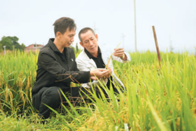 撫州市廣昌縣頭陂鎮(zhèn)頭陂村黨組織書記后備力量符子強(左)向致富能手學習水稻種植技術(shù)。