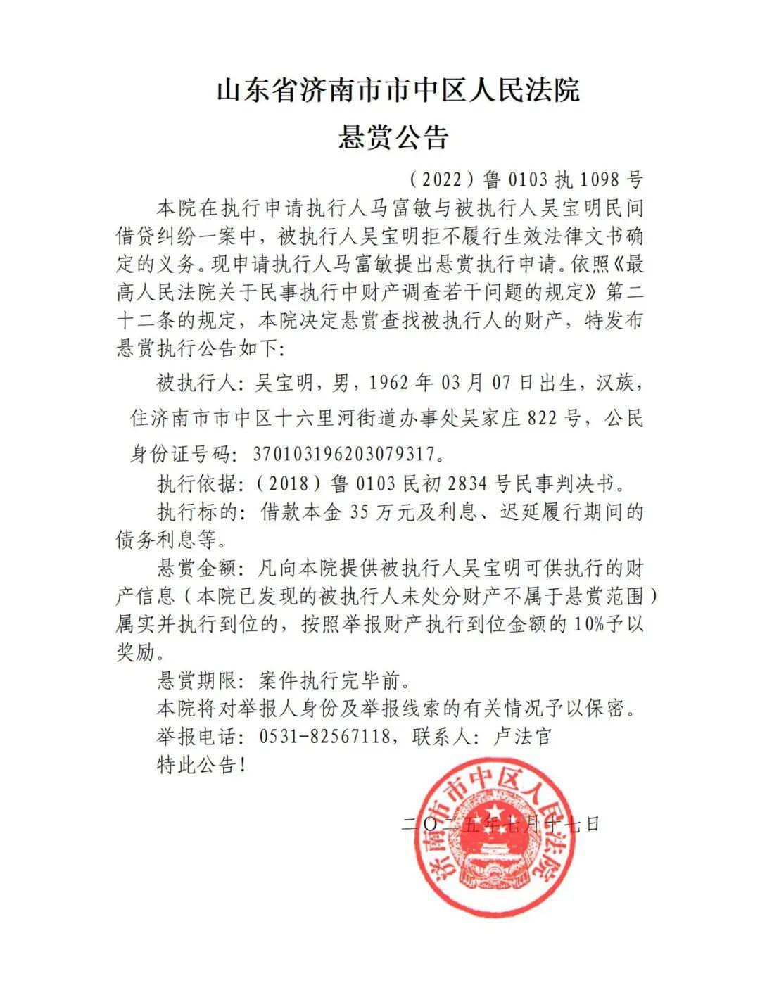 懸賞金額:凡向本院提供被執(zhí)行人吳寶明可供執(zhí)行的財(cái)產(chǎn)信息(本院已發(fā)現(xiàn)的被執(zhí)行人未處分財(cái)產(chǎn)不屬于懸賞范圍)屬實(shí)并執(zhí)行到位的,按照舉報(bào)財(cái)產(chǎn)執(zhí)行到位金額的10%予以獎(jiǎng)勵(lì)。