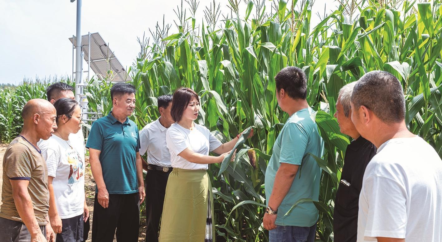 梨樹(shù)縣鳳凰山農(nóng)機(jī)農(nóng)民專業(yè)合作社理事長(zhǎng)韓鳳香正在和村民們查看玉米授粉和長(zhǎng)勢(shì)情況。高鴻 攝