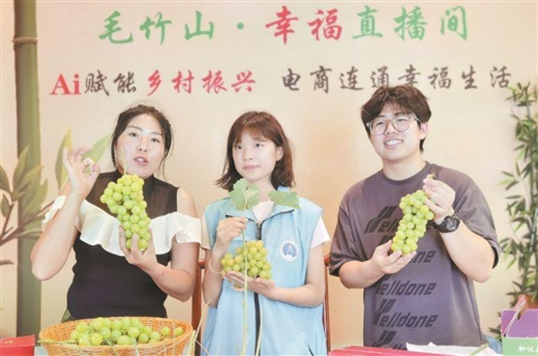 “陽光玫瑰葡萄皮薄肉脆,汁水豐盈……”在全州毛竹山幸福直播間,主播李清清和助手正捧著新鮮葡萄向網(wǎng)友熱情推介,為即將大量上市的毛竹山葡萄造勢。