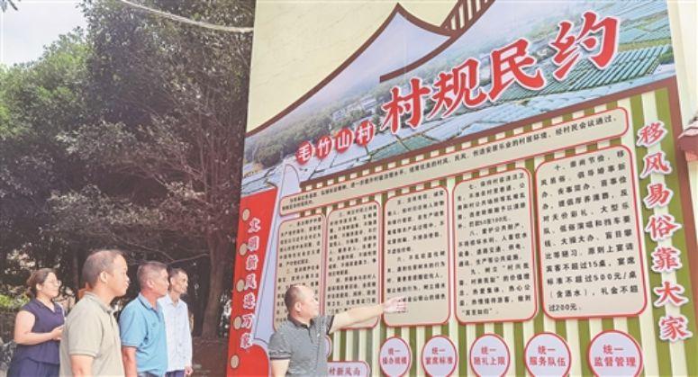盛夏時節(jié),在廣西壯族自治區(qū)桂林市全州縣才灣鎮(zhèn)南一村委毛竹山村,村口宣傳欄上嶄新的《村規(guī)民約》格外醒目。曾讓村民愁眉不展的“仔仔債”(當?shù)嘏f俗,老人去世時,外嫁女需置辦大量煙酒紅包、點心等“仔仔”,分發(fā)給吊唁親友)已成為歷史。