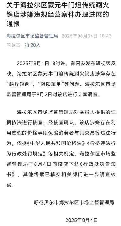 8月2日,海拉爾區(qū)市場監(jiān)管局也展開立案調(diào)查。最新通報(bào)顯示,8月4日,內(nèi)蒙古呼倫貝爾市海拉爾區(qū)市場監(jiān)督管理局針對(duì)涉事火鍋店涉嫌違規(guī)經(jīng)營一案向該店下達(dá)了《行政處罰告知書》。