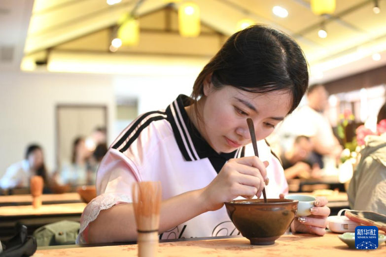 8月5日,在浙江省杭州市余杭區(qū)徑山村,一名游客體驗(yàn)傳統(tǒng)點(diǎn)茶。記者 毛竹 攝