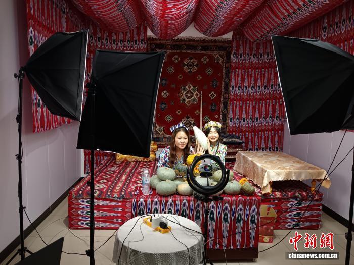 “直播間所見即所得!粉不粉?來,你們看看!”新疆阿克蘇市電商產(chǎn)業(yè)園的一個直播間里,主播雨桐正和搭檔一起賣南瓜,她穿著維吾爾族服飾,一邊用勺子刮著粉糯的南瓜一邊激情澎湃地介紹。
