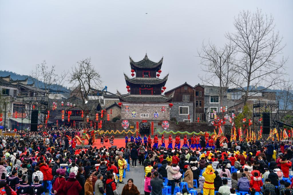 2月11日拍攝的貴州錦屏隆里“村晚遇元宵·來(lái)隆里玩花臉龍”活動(dòng)現(xiàn)場(chǎng)。新華社記者 楊文斌 攝
