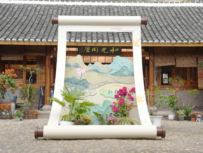 茅洋農(nóng)民畫主題館,坐落于白巖下村和光院,簡(jiǎn)單質(zhì)樸的木結(jié)構(gòu)建筑如同形象質(zhì)樸的農(nóng)民畫一樣完美融入這片土地。碩大的藝術(shù)畫框裝置像土地生長(zhǎng)的藝術(shù)容器,既有農(nóng)民畫扎根土地的滾燙,也有文創(chuàng)產(chǎn)品帶著絢麗色彩奔赴日常的輕盈。