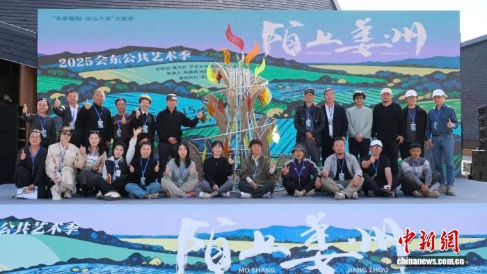 嘉賓在開幕現(xiàn)場(chǎng)與駐地作品《焱焱》合影。主辦方供圖