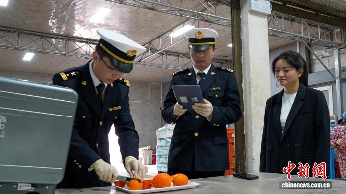 海關工作人員對橙子進行檢測。毛文濤 攝