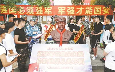 七月下旬,遼寧省遼陽市弓長(zhǎng)嶺區(qū)人武部開展“逐夢(mèng)軍營(yíng)、榮光閃耀”主題征兵宣傳活動(dòng)?;顒?dòng)現(xiàn)場(chǎng),現(xiàn)役軍官、雷鋒宣講團(tuán)成員等征兵宣傳員在雷鋒塑像前為適齡青年就參軍入伍相關(guān)問題進(jìn)行解答。譚長(zhǎng)俊攝