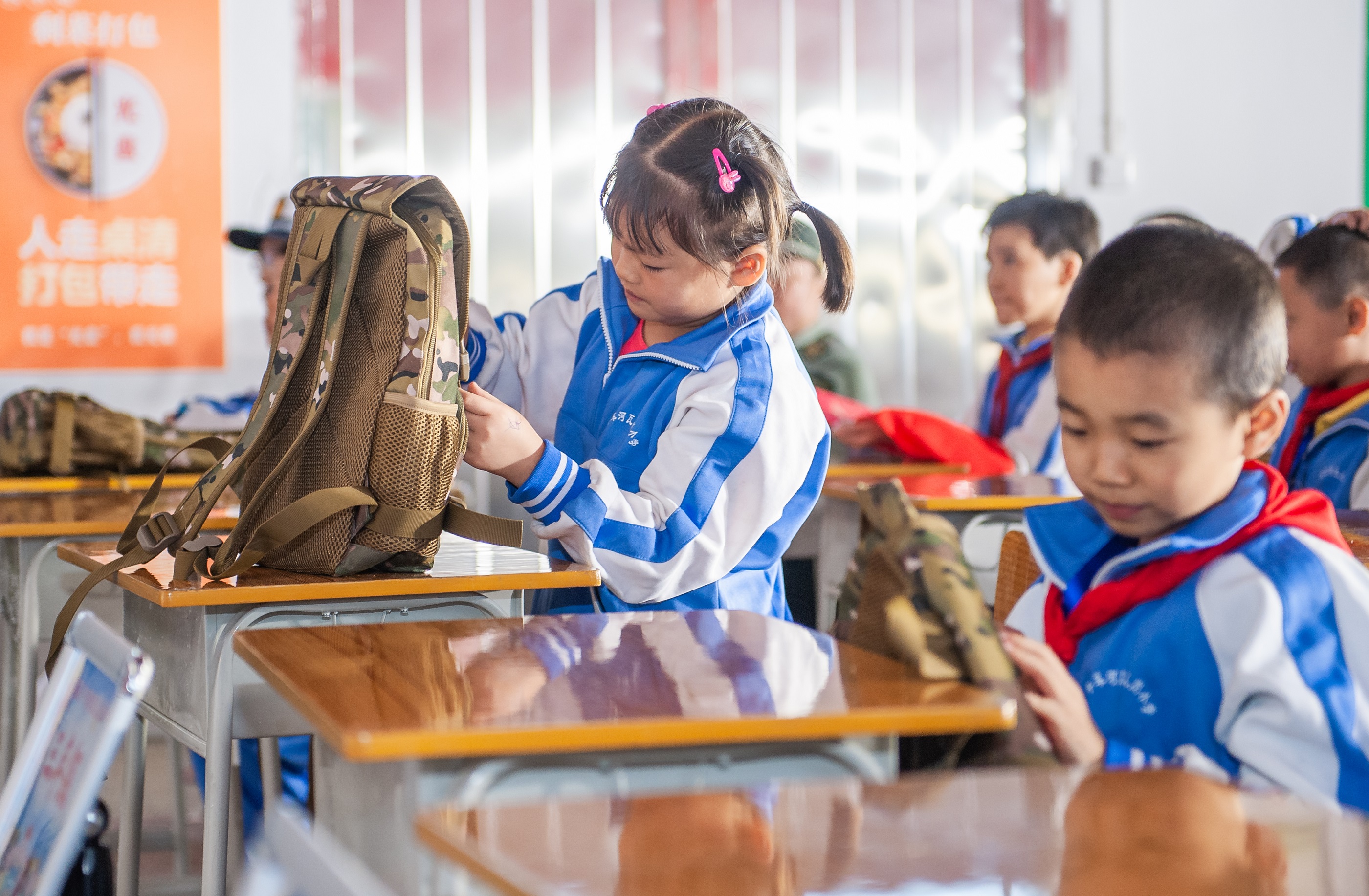 圖為瓦兒崗小學(xué)學(xué)生開心地打開迷彩小書包。彭三珊 攝