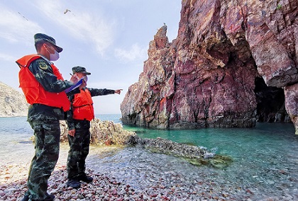 圖為海警執(zhí)法員對轄區(qū)無居民海島進行踏查。包新宇 攝