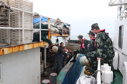 圖為海警執(zhí)法員對可疑船只進行登臨檢查。江壯志 攝