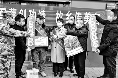 一人立功,全家光榮。1月29日,江蘇省徐州市豐縣人武部、退役軍人事務局和豐縣郵儲銀行負責人來到軍人張琦家中,為其家人送去立功喜報、獎金、春聯(lián)年畫和慰問品。