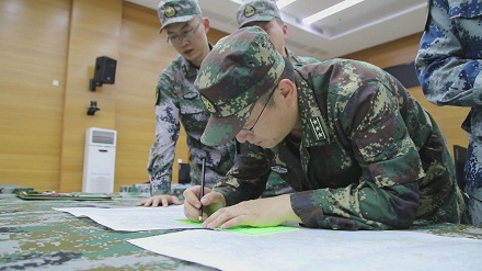 圖為李曦(中)以圖上作業(yè)形式與戰(zhàn)友進行戰(zhàn)法訓法研究。李元昊 攝