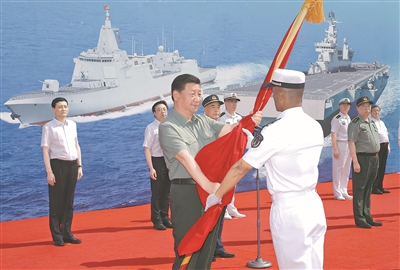 4月23日,海軍三型主戰(zhàn)艦艇——長(zhǎng)征18號(hào)艇、大連艦、海南艦在海南三亞某軍港集中交接入列。中共中央總書記、國(guó)家主席、中央軍委主席習(xí)近平出席交接入列活動(dòng)并登上艦艇視察。這是習(xí)近平向海南艦授予軍旗、命名證書。 本報(bào)記者 穆瑞林 攝