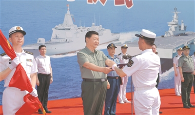 4月23日,海軍三型主戰(zhàn)艦艇——長(zhǎng)征18號(hào)艇、大連艦、海南艦在海南三亞某軍港集中交接入列。中共中央總書記、國(guó)家主席、中央軍委主席習(xí)近平出席交接入列活動(dòng)并登上艦艇視察。這是習(xí)近平向大連艦授予軍旗、命名證書。 本報(bào)記者 范顯海 攝