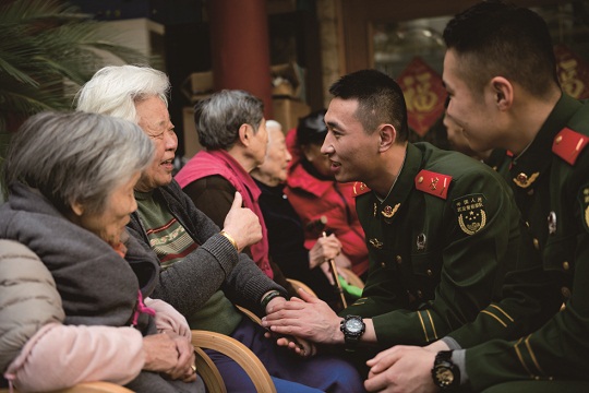 圖為武警上??傟爤?zhí)勤第四支隊執(zhí)勤十中隊官兵到黃浦老年公寓開展服務。揭亦凡 攝