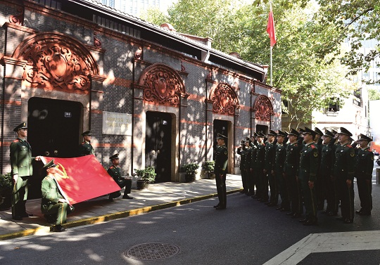 圖為武警上??傟爤?zhí)勤第四支隊執(zhí)勤十中隊官兵在中共一大紀念館前重溫入黨誓詞。徐延鈞 攝