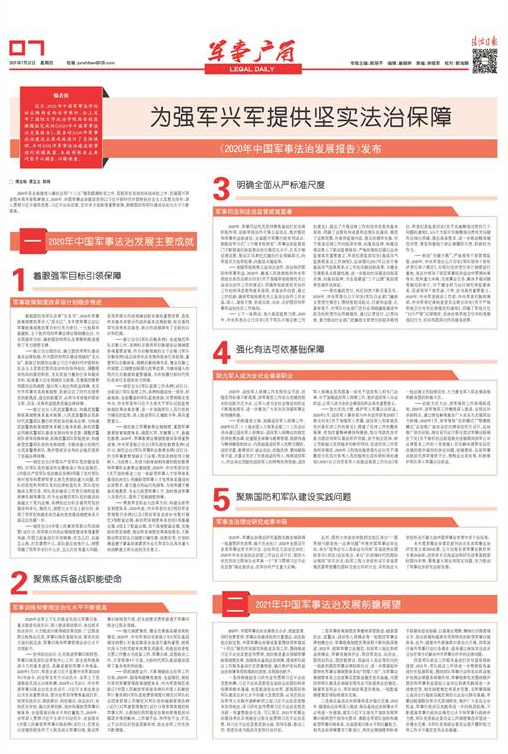 2020年,中國軍事法治發(fā)展亮點眾多、成就顯著,同時也要看到,軍事法治建設依然任重道遠。站在新起點新征程,中國軍事法治建設緊緊圍繞我軍建設“十四五”規(guī)劃布局謀劃和推進各項工作,圍繞推進習近平法治思想宣傳貫徹、加快推進重點領域軍事政策制度改革、加強練兵備戰(zhàn)法治保障、提高軍隊政法工作服務備戰(zhàn)打仗質量效能、強化維護官兵權益法治保障等將取得新的成效、實現新的躍升。