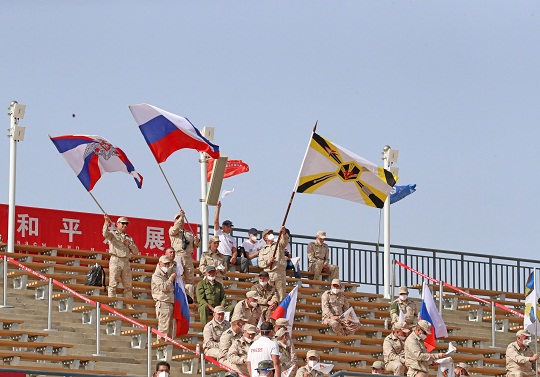 圖為8月22日,“國(guó)際軍事比賽-2021”中國(guó)庫(kù)爾勒賽區(qū)在“蘇沃洛夫突擊”比賽場(chǎng)正式開幕,觀賽官兵歡呼。張永進(jìn) 攝