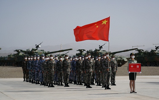 圖為8月22日,“國(guó)際軍事比賽-2021”中國(guó)庫(kù)爾勒賽區(qū)在“蘇沃洛夫突擊”比賽場(chǎng)正式開幕,中國(guó)人民解放軍代表隊(duì)整齊列隊(duì)。新華社發(fā) 郭中正 攝