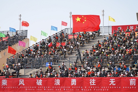 旌旗迎風(fēng)招展,和平友誼同筑。白俄羅斯、埃及、俄羅斯、烏茲別克斯坦、委內(nèi)瑞拉、越南參賽代表隊(duì)依次入場(chǎng)。當(dāng)一面面不同國(guó)家的國(guó)旗通過(guò)觀禮臺(tái)時(shí),現(xiàn)場(chǎng)官兵熱烈鼓掌,對(duì)遠(yuǎn)道而來(lái)的參賽隊(duì)員表示歡迎。東道主中國(guó)參賽代表隊(duì)最后一個(gè)入場(chǎng),參賽隊(duì)員們軍容嚴(yán)整、精神抖擻,在五星紅旗引領(lǐng)下通過(guò)觀禮臺(tái)。