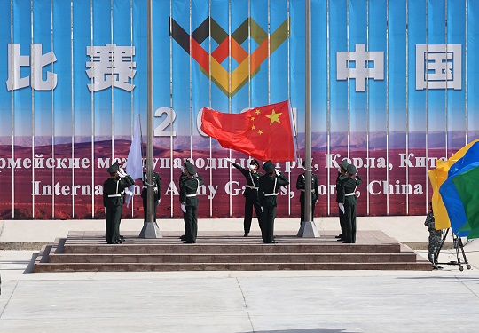 圖為8月22日,“國(guó)際軍事比賽-2021”中國(guó)庫(kù)爾勒賽區(qū)在“蘇沃洛夫突擊”比賽場(chǎng)正式開幕,會(huì)場(chǎng)上升起中華人民共和國(guó)國(guó)旗。張永進(jìn) 攝