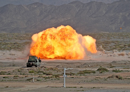圖為8月22日,“國(guó)際軍事比賽-2021”中國(guó)庫(kù)爾勒賽區(qū)在“蘇沃洛夫突擊”比賽場(chǎng)正式開幕,軍事課目演示中綜合掃雷車進(jìn)行實(shí)彈射擊。羅興倉(cāng) 攝