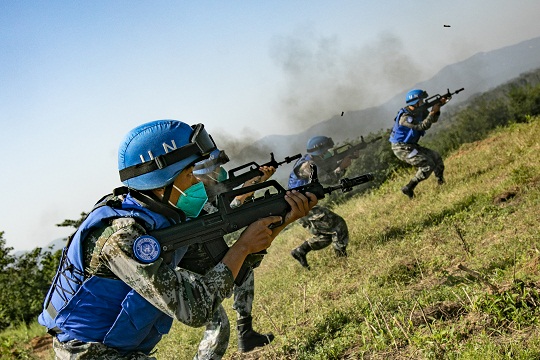 圖為在“共同命運-2021”國際維和實兵演習中,我方參演分隊正在展開戰(zhàn)斗隊形。焦光輝 攝