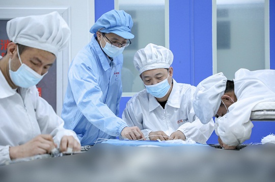 圖為科研團(tuán)隊(duì)在半剛性太陽(yáng)電池陣生產(chǎn)現(xiàn)場(chǎng)。尹冬寧 攝