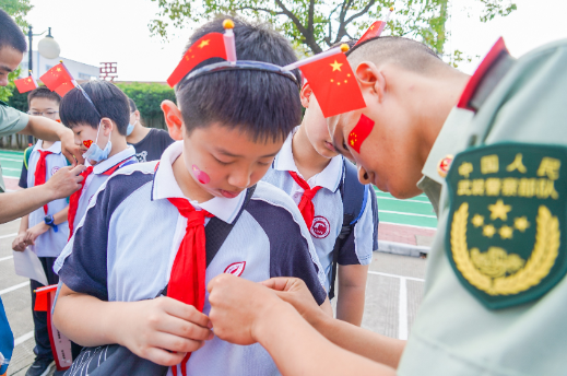圖為武警戰(zhàn)士給學(xué)生貼上國旗貼紙,佩戴活動(dòng)胸標(biāo)。