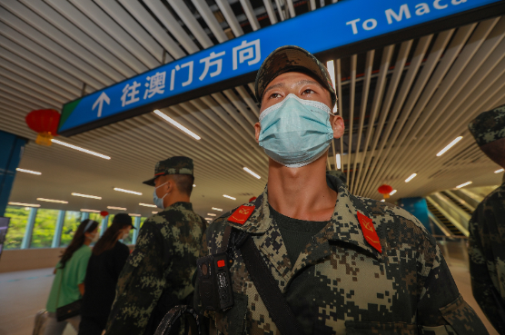 國慶節(jié)期間,在廣東省珠海市青茂口岸熙熙攘攘的人潮中,全副武裝的武警廣東總隊執(zhí)勤第二支隊某中隊官兵格外醒目。據(jù)統(tǒng)計,作為粵澳旅檢通關新通道的青茂口岸,自9月8日正式開通上勤以來,中隊官兵累計為300余名跨境旅客提供問詢、送藥等服務。