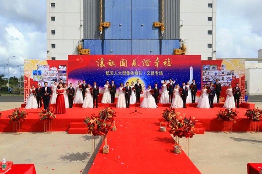 2020年10月1日,當(dāng)中秋遇上國慶,中心在西昌和文昌發(fā)射場,為52對航天新人同步舉行“讓祖國見證幸福”集體婚禮。