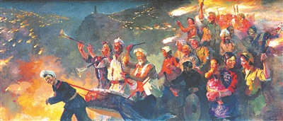 油畫《延安火炬》由我國當(dāng)代著名油畫家蔡亮創(chuàng)作,表現(xiàn)的是1945年抗戰(zhàn)勝利后,延安軍民舉行火炬游行、歡慶勝利的情景。
