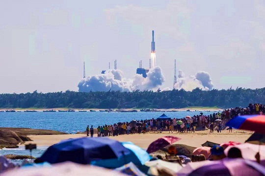 今年9月20日,海灘上、椰林旁、山頂上人山人海。伴隨著一陣山呼海嘯般的巨響,長征七號火箭托舉著天舟三號貨運飛船一飛沖天,中國空間站建設進入承上啟下的關鍵一步。人們揮舞著國旗、高唱愛國歌曲、眼含熱淚,目送“天舟”奔赴太空。那個下午,騰飛的火箭與碧海藍天,歡呼的人群與紅色旋律,構成了一幅中華民族探索浩瀚宇宙的壯美畫卷。