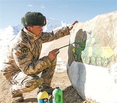 為鼓勵官兵積極加入文化創(chuàng)作隊伍、豐富業(yè)余文化生活,該團(tuán)還專門在雪域高原上建起一間創(chuàng)作工作室。隨后,參與到文化創(chuàng)作的官兵越來越多。他們利用現(xiàn)有條件,畫出了一幅幅表現(xiàn)高原官兵精神風(fēng)貌的作品,譜出了一首首激情澎湃的歌曲,展現(xiàn)了戍邊官兵熾熱的愛國情懷,受到全團(tuán)官兵的好評。